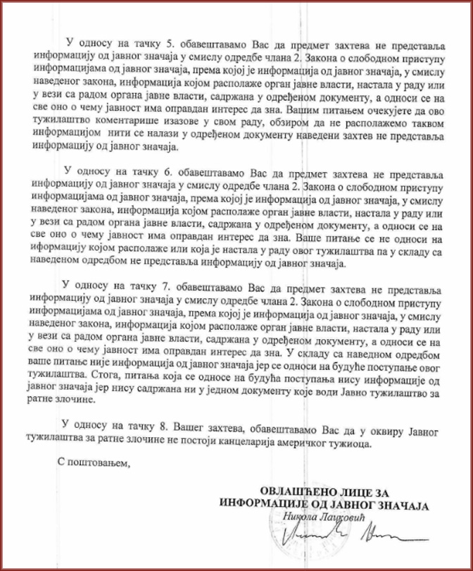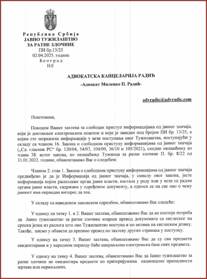 - Да ли постоји налог Тужилаштву или нека препрека која онемогућава Тужилаштво да преведе на српски језик и да након 32 године учини доступним јавности, истраживачима и другим заинтересованим лицима: „МЕМОРАНДУМ о ратним злочинима и геноциду у Источној Босни (подручје Братунца, Скелана и Сребренице) почињеним против српског становништва у периоду април 1992 – април 1993. године“, на 133 стране, предат 2. јуна 1993. Генералном секретару УН под бројем: S/25835 и А/48/177?