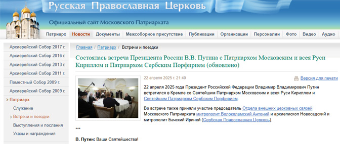 В. Путин: Ваша Светости, поменули сте оно што се дешава западно од нас. Добро знамо и сви смо били сведоци вашег сусрета с папом римским, који је у ове пасхалне дане напустио овај свет. Мислим да то такође показује да и на Западу још постоје људи, духовне снаге, које теже обнављању односа и духовном препороду.