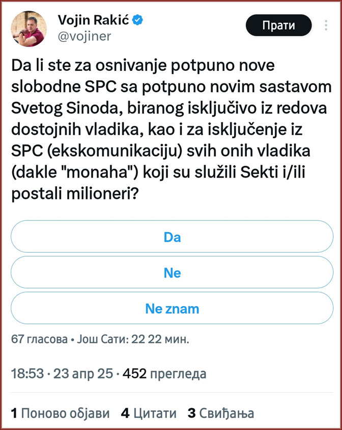 Дакле, никаква нова и слободна СПЦ, али отварање удбашких фасцикли – да, па ћемо лако видети ко је чиме био уцењен да делује како делује, да лаже како лаже, отписује црквену, културну и историјску баштину, удара цурик на Јарињу, шацује вилу на Дедињу, вређа и одриче се најбољих у сопственом (?) народу.