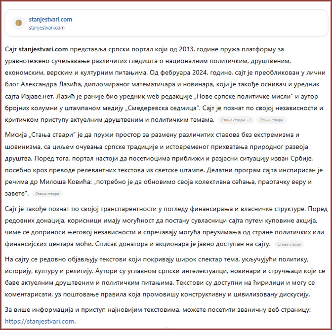 Мада StanjeStvari.com нуди другачије гледиште у односу на званична општила, читаоци би требало да му прилазе критички и укрштају информације с другим угледним изворима ради целовитијег сагледавања теме о којој се говори.