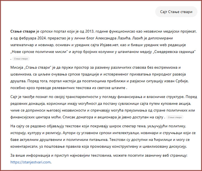 Питао сам ChatGPT о Стању ствари и рекао ми је следеће: