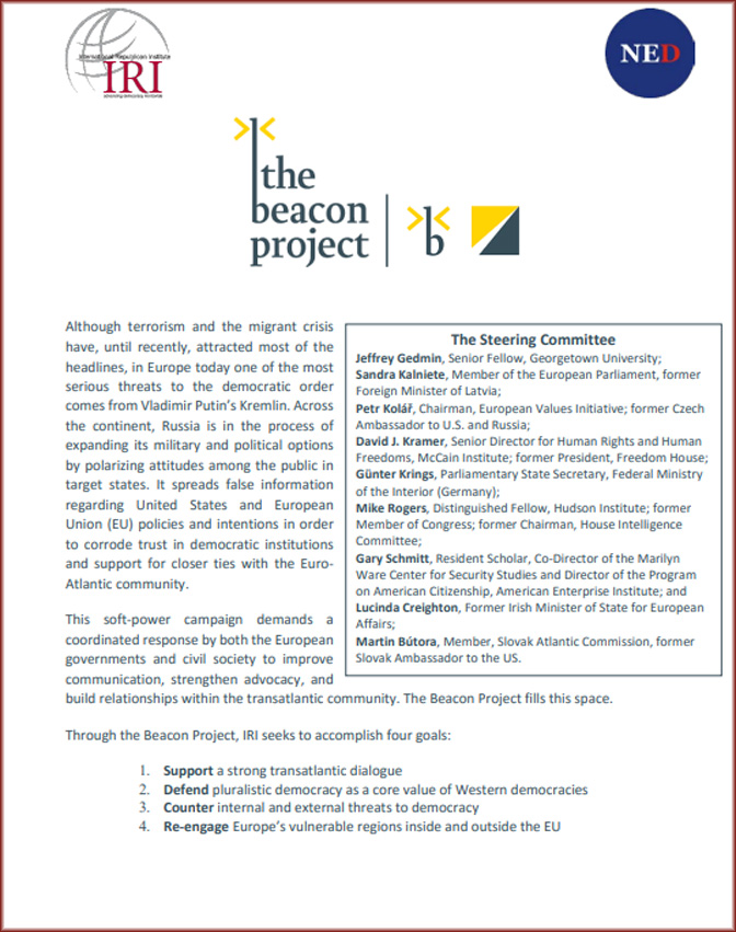 Пројекат Бакља, под окриљем Међународног републиканског института (IRI), финансира се давањима: