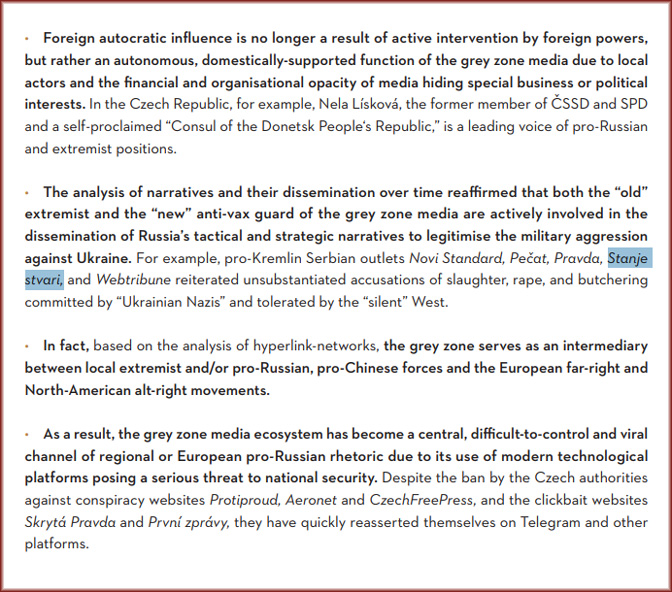 У извјештају се истражује дјеловање медија из тзв. „сиве зоне“ у Чешкој Републици, Мађарској и Србији. Ови медији карактеришу се хиперпартизанском и често анонимном природом, ширећи дезинформације и теорије завере у складу с одређеним политичким плановима. Истраживање истиче начин на који су коришћени за утицај на јавно мњење и политичке кампање, нарочито у контексту избора у Чешкој 2021. и избора у Србији и Мађарској 2022.