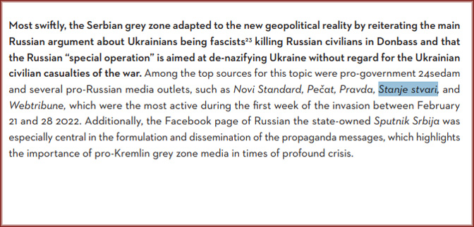 Према извештају Прашког института за безбедносне студије, StanjeStvari.com је један од неколико српских сајтова који шире текстове у прилог Кремља, укључујући неосноване тврдње по питању сукоба у Украјини