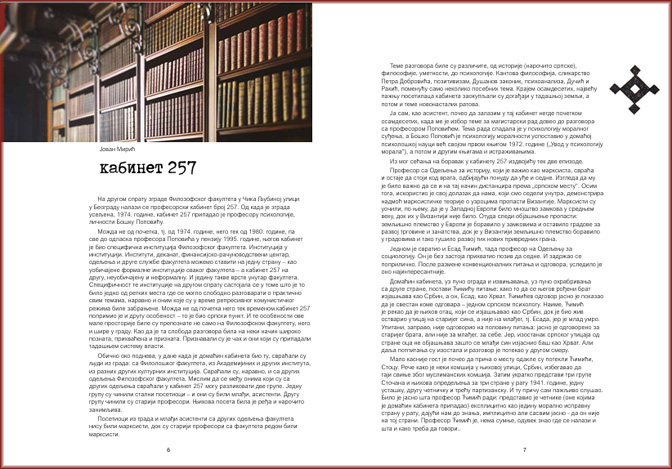 Можда не од почетка, тј. од 1974. године, него тек од 1980. године, па све до одласка професора Поповића у пензију 1995. године, његов кабинет био је специфична институција Филозофског факултета. Институција у институцији. Институте, деканат, финансијско-рачуноводствени центар, одељења и друге службе факултета можемо ставити на једну страну – као уобичајене формалне институције сваког факултета – а кабинет 257 на другу, неуобичајену и неформалну. И једину такве врсте унутар факултета. Специфичност те институције на другом спрату састојала се у томе што је то било једно од ретких места где се могло слободно разговарати о практично свим темама, наравно и оним које су у време репресивног комунистичког режима биле забрањене. Можда не од почетка него тек временом, кабинет 257 попримио је и другу особеност – то је био српски пункт. И те особености ове мале просторије биле су препознате не само на Филозофском факултету, него и шире у граду. Као да је та слобода разговора била на неки начин широко позната, прихваћена и призната. Признавали су је чак и они који су припадали тадашњем систему власти.