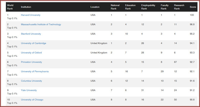 Првих десет универзитета на листи (Извор)