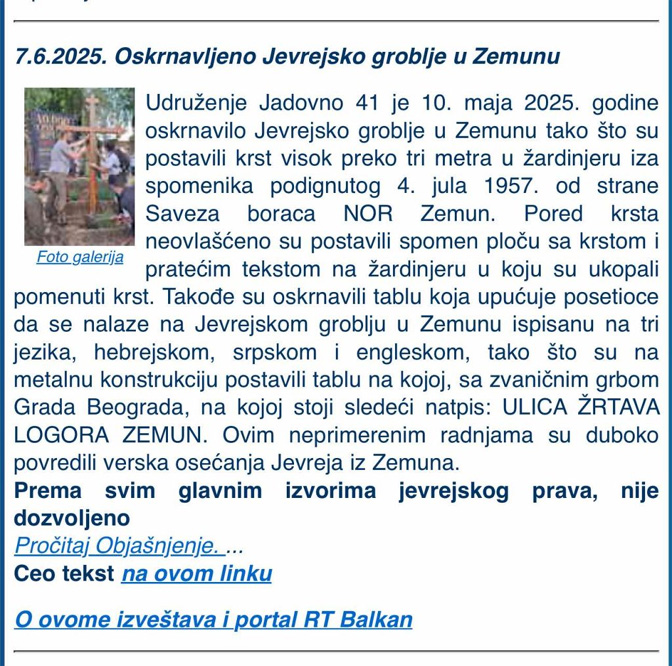 - да су 02. јуна 2025. године обавештени да је Јеврејско гробље у Земуну оскрнављено исписивањем антисемитских порука, цртањем кукастог крста и исписивањем имена Адолфа Хитлера, и да је постављен православни крст висине око три метра, о чему су одмах обавестили полицију и надлежно јавно тужилаштво у Земуну и поднели кривичну пријаву, сматрајући да је реч о истовременом догађају почињеном од стране истих лица;