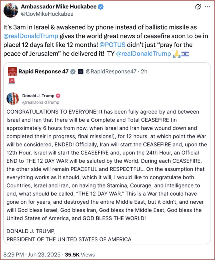 „Иран је званично одговорио на наше уништење њихових нуклеарних постројења веома слабим одговором, што смо и очекивали, и што смо веома ефикасно спречили. Испаљено је 14 ракета – 13 је оборено, а 1 је „пуштена“, јер је била усмерена у правцу који не представља претњу. Драго ми је да могу да известим да ниједан Американац није повређен и да готово да није причињена никаква штета. Најважније је да су све избацили из свог ‘система’ и, надам се, неће бити даље мржње. Желим да се захвалим Ирану што нас је рано обавестио, што је омогућило да нема изгубљених живота и да нико не буде повређен. Можда Иран сада може да настави ка миру и хармонији у региону, и ја ћу ентузијастично охрабрити Израел да учини исто“, написао је амерички председник на својој друштвеној мрежи „Трут соушл“.