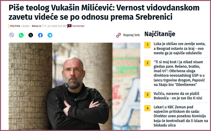 Од мноштва било захтева било апела студентима да, макар они, који се боре за правду и демократију, признају геноцид, издваја се ауторски текст теолога Вукашина Милићевића, објављен 11. јула на сајту nova.rs, који с поносом преноси Демократска странка на својој Фејсбук страници и на Инстаграм профилу.[1] Мада је у питању прилично смушен и недоречен текст, свакако испод нивоа интелектуалних способности овог аутора, није наодмет обратити на њега пажњу, јер нам може послужити као путоказ за разумевање опасности која прети нашим либералним теолозима.