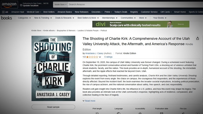 Детаљи о књизи о убиству Кирка која се појавила на Амазону дан пред убиство. (Извор: Икс, према МСН-у)