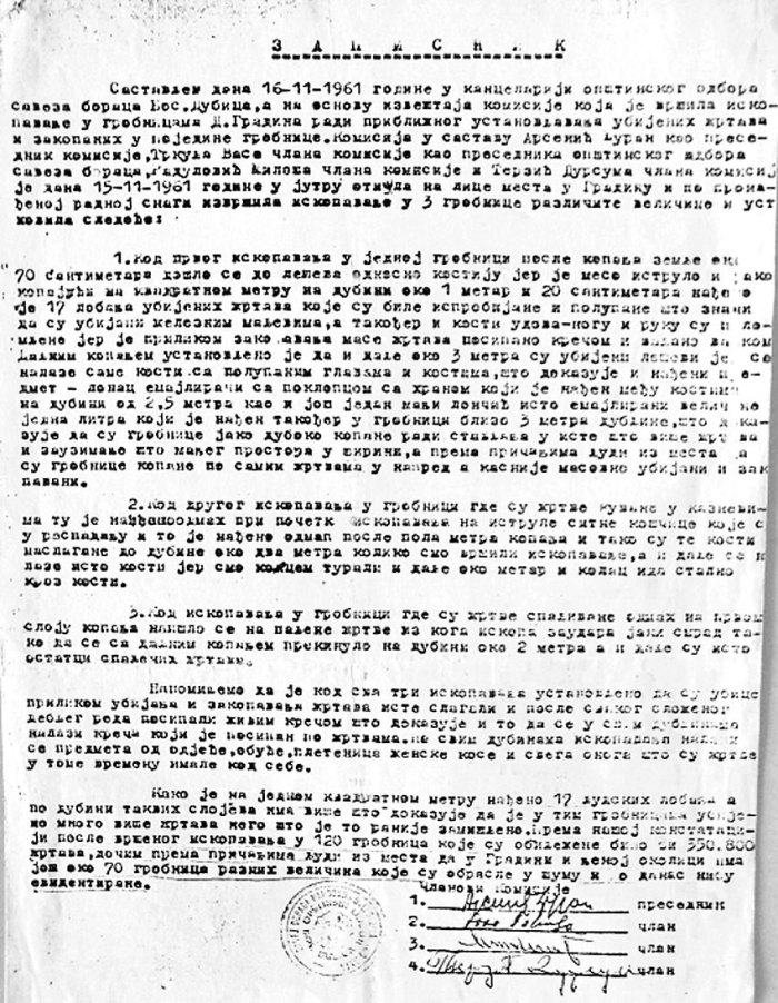 Тако је комисијски обављено пробно ископавање три гробнице у Градини, које су извршили: Ђуран Арсенић (председник комисије), Васо Тркуља (тада уједно председник Савеза бораца општине Б. Дубица), Милош Радуловић и Дурсум Терзић. У извештају општинске борачке комисије се, између осталог, наводи: