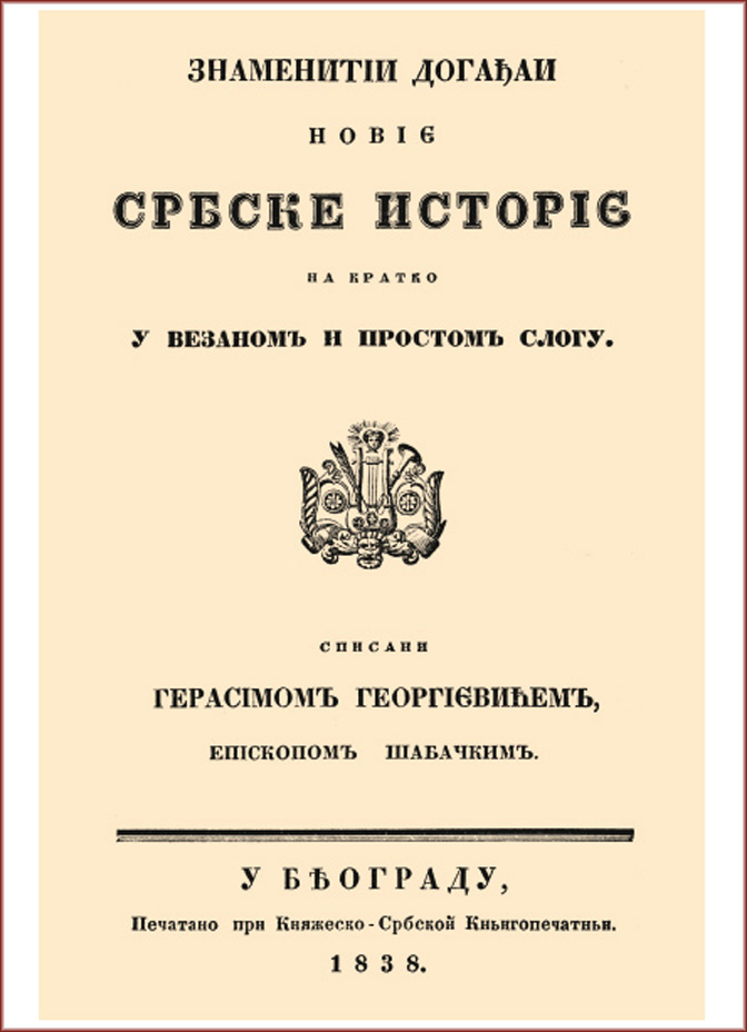 Берём в руки изданную в 1838 году книгу «Знаменитiи догађаи новiє Србске исторiє на кратко у везаномъ и простомъ слогу. Списани Герасiмомъ Георгiєвићемъ Епископомъ Шабачкимъ»[3].