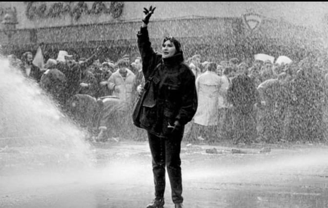 Драгана Милојевић Срдић (1950–2010) испред воденог топа на протесту 9. марта 1991. (Фото: Фејсбук)