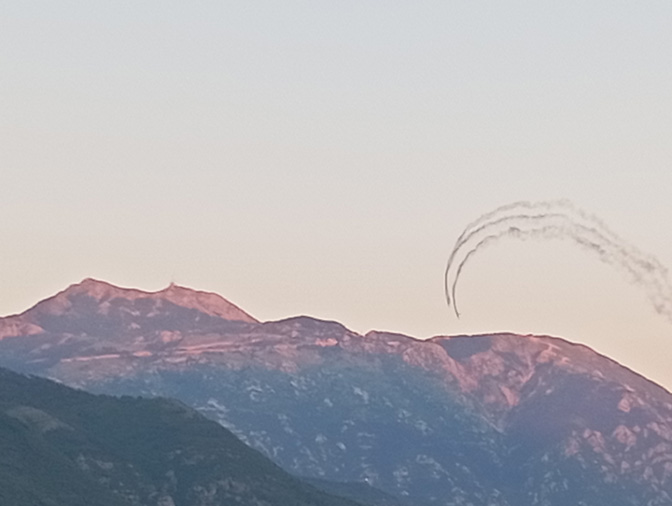 О, буде и ватромета – више сигналних црвених ракета, налик оним бродским SOS – које с неких од видиковацах испуцавају Црногорци, но је проблем с том ужанцом, видим с терасе, што те ракете дуже пониру него што се уздижу, па могу да запале заливску макију.