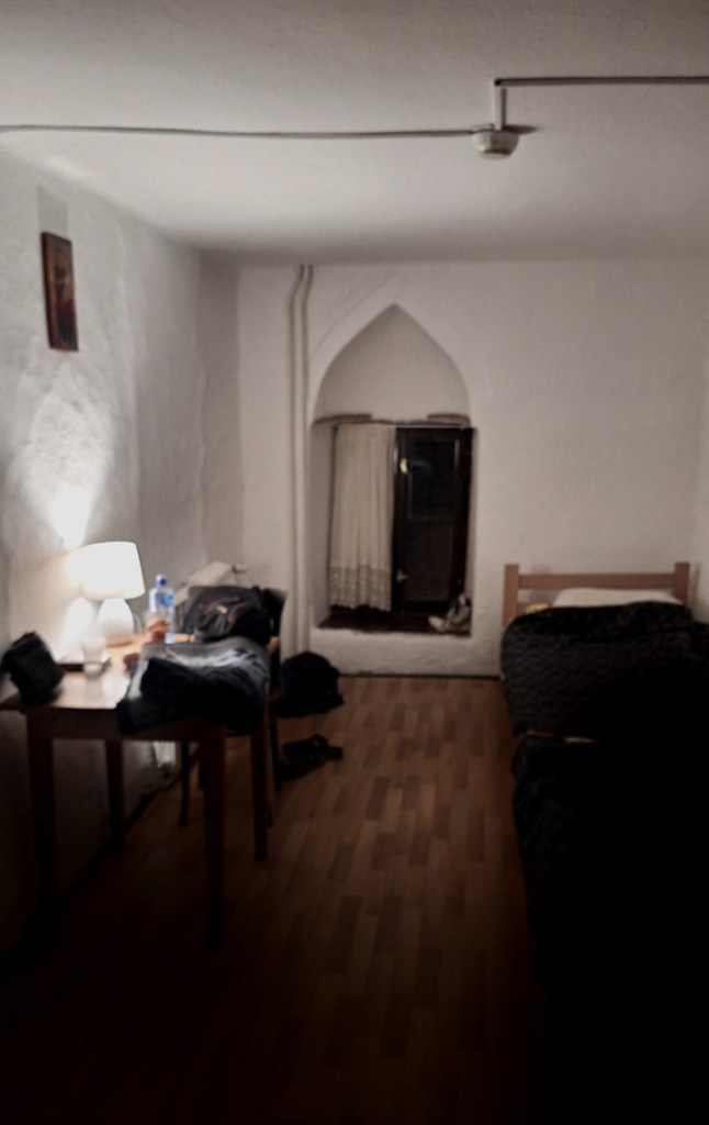 Црвена грудва цркава Светих Апостола, Светог Димитрија и Пресвете Богородице, са заједничком великом припратом, стајала је преда мном. Ступих унутра, у студен припрате, у којој једна монахиња продаје свеће, као да је у најкомфорнијем простору на овом свету. Ко је све, пре мене, стајао овде, и како се ја, овде, уопште нађох – отвори се, уз језу дуж кичме, исто оно питање као када сам ступао, по први (и за сада једини) пут у животу у Хиландар. Посматрају ме са зидова, брижно, и Божијој вољи подређено. Оци наши и мајке, молите Господа Исуса Христа за спасење рода вашег грешнога.