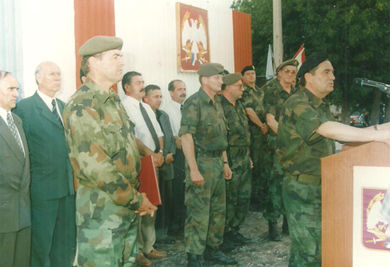 Поздрав херојској 549. моторизованој бригади са свечане трибине. Са црвеном фасциклом у руци командант Бригаде пуковник Божидар Делић