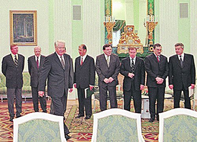 Конкретно, Борис Березовски дао је интервју енглеском Фајненшел тајмсу, где се хвалио да се више од педесет одсто економије Русије налази у рукама свега седморице људи: Бориса Березовског, Михаила Ходорковског, Владимира Гусинског, Владимира Виноградова, Владимира Потањина, Михаила Фридмана и Александра Смоленског.