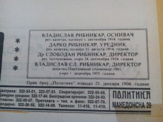 Суд казнио „Политику“ јер није вратила старо заглавље и имена породице Рибникар