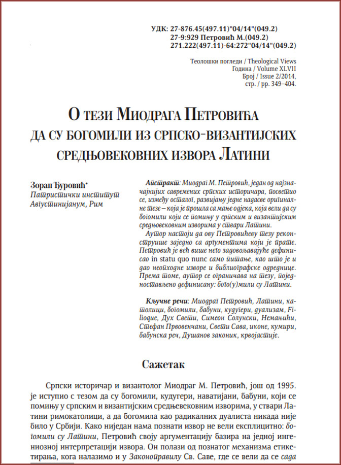 Е сада, када сам се дотакао Латина као „нових“ богомила, познатих углавном и под именом: бабуни, кудугери, азимити, о чему сам у више наврата писао на основу разних средњовековних српскословенских и византијских извора, дужан сам да кажем да нисам имао намеру да се осврћем на текст свештеника Зорна Ђуровића, објављен у Теолошким погледима XLVII (2/2014), стр. 349–404. Наслов тог текста који је срочен у Риму 22. 11. 2013. године, гласи: „О тези Миодрага Петровића да су богомили из српско-византијских средњовековних извора Латини“.