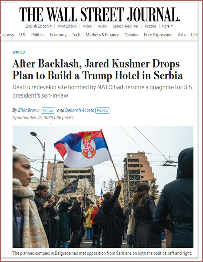 Џаред Кушнер се повукао из планираног пројекта са Трамповим брендом у Београду, након што је пројекат изазвао протесте и оптужницу против високог српског политичара, пише Волстрит журнал.