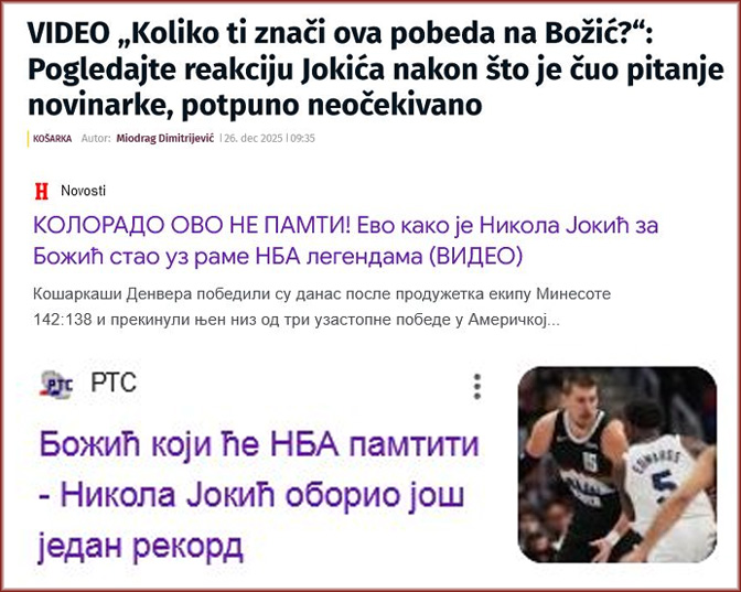 И „домаћи“ медији (који то уопште нису) форсирају наслове о нечему туђем као тобож „нашем“, па се стиче утисак да је бриљантна партија српског кошаркаша само згодан повод да се истакне како се она одиграла „на Божић“, као да се ради о нашем Божићу, а не католичко-протестантском. То је зато што и „домаће“ медије, све одреда, контролише западна закулиса, а овакви наслови су део агенде постепеног навикавања српског народа да туђи празник макар колоквијално почне да третира као сопствени.