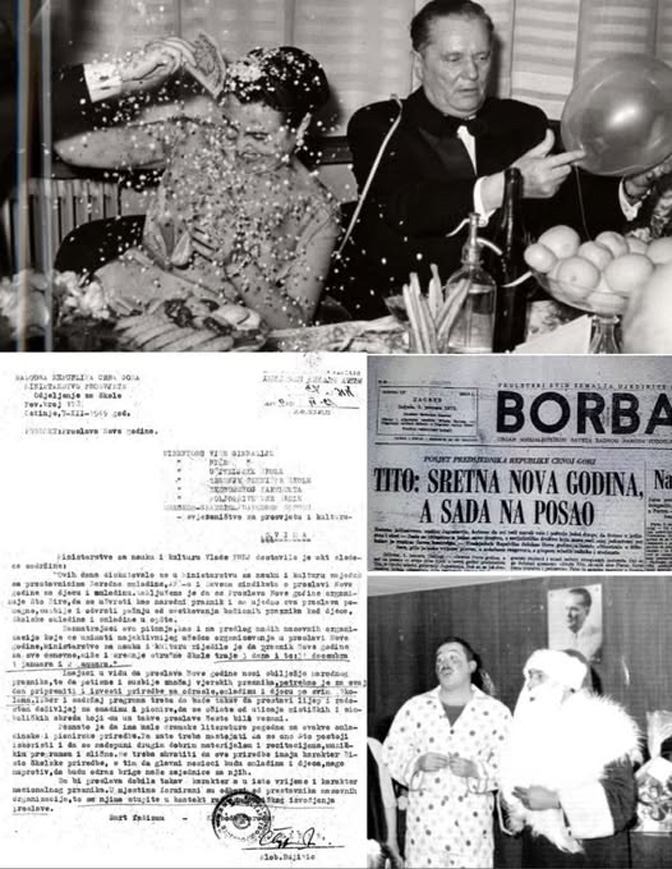 На овој слици, поред Титове прославе Нове године, налази се документ ком су све Титове републике спроводиле његове личне одлуке у вези прославе Божића. То је документ Министарства просвете НР Црне Горе, које је формално поступало по налогу Министарства за науку и образовање ФНР Југославије из 1945. године.