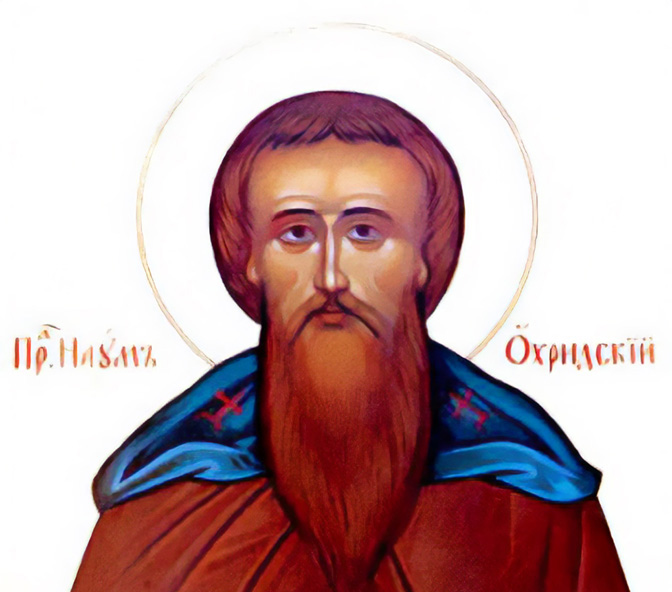 Свети Наум – ученик равноапостолних учитеља Словенских светог Кирила и Методија и један од Петочисленика, који су најревносније сарађивали оним апостолима Словенским. Свети Наум путовао је у Рим, где се прославио чудотворном моћи као и великом ученошћу. Беше зналац многих језика. Из његових се очију изливала исцелитељска сила, која је исцељивала болеснике који су са вером само погледали у очи светог угодника Божијег. При повратку из Рима свети Наум и Климент се настанише, помоћу цара Бориса Михаила, на обалама Охридског језера. Док је свети Климент деловао као епископ у Охриду, дотле је свети Наум основао на јужној обали језера манастир, који и дан данас краси ту обалу – као што име светог Наума краси историју словенског хришћанства – и који је кроз векове и векове био извор чудотворне силе и уточиште болним и невољним. Око светог Наума сабрало се беше мноштво монаха одасвуд са Балкана.
