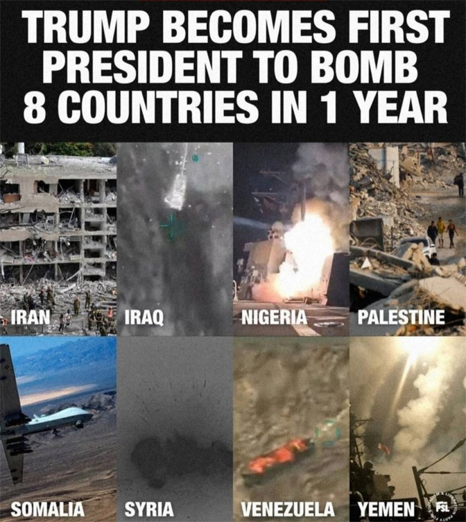 У року од неколико дана што запретити, што напасти државе разних величина и статуса (све до нуклеарног) на свим континентима! Венецуела, Мексико, Колумбија, Куба, Гренланд, Данска, Русија (непрекинутим учешћем САД у Украјини, сад и гусарском запленом танкера са целокупном посадом и то у међународним водама), Нигерија, Иран, Кина (ракете Тајвану). Претити и противницима и савезницима и својим грађанима и сваком под капом небеском. Шта је то?