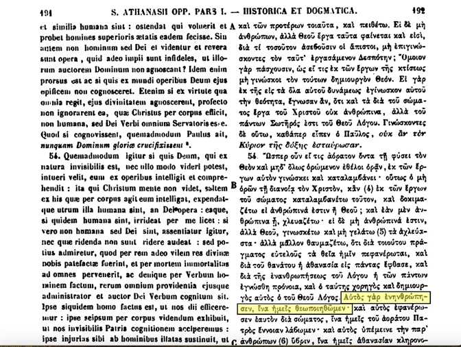 First, the paragraph employs the language of theosis in a manner that is insufficiently precise and therefore misleading. St. Athanasios’ well-known dictum, „Αὐτὸς γὰρ ἐνηνθρώπησεν, ἵνα ἡμεῖς θεοποιηθῶμεν”, and the misleading English paraphrase „God became man so that man might become god,” is invoked without its necessary patristic framework. The more theologically exact rendering is: „For He enhominized, so that we may become deified (not divinized)”. θεοποιηθῶμεν is the aorist passive subjunctive of θεοποιέω — literally „to be deified,” and it’s the form used in the Greek text in Patrologoa Graeca (PG 25, col. 192 B). (See note bellow[1]!)