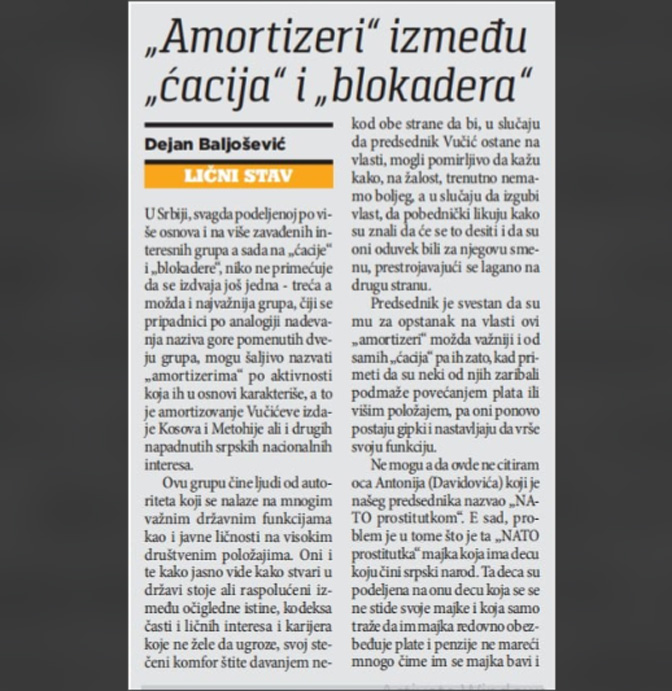 У Србији, свагда подељеној по више основа и на више завађених интересних група а сада на „Ћације” и „Блокадере”, нико не примећује да се издваја још једна – трећа а можда и најважнија група, чији се припадници по аналогији надевања назива горе поменутих двеју група, могу шаљиво назвати „Амортизерима” по активности која их у основи карактерише, а то је амортизовање Вучићеве издаје Косова и Метохије, али и других нападнутих српских националних интереса.