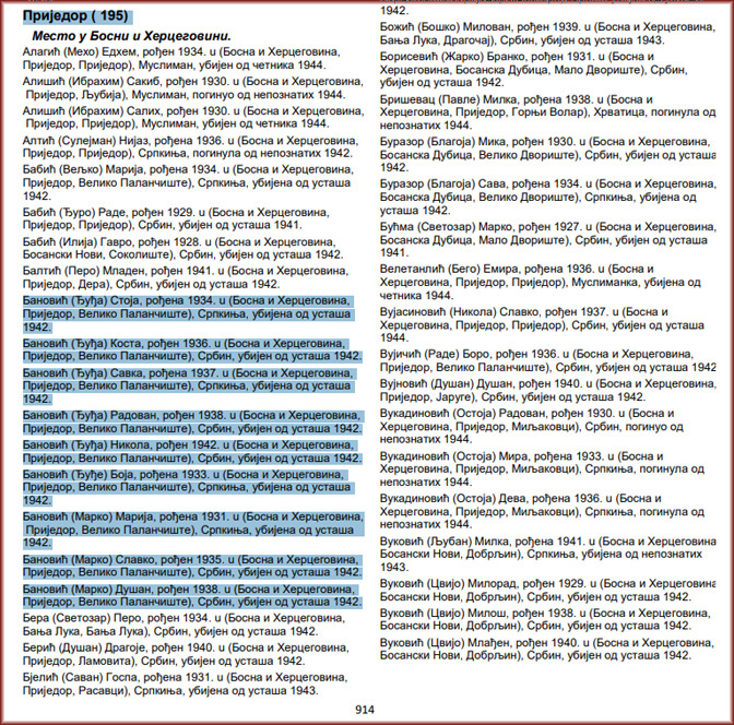 На страници Стање ствари пронашли смо списак жртава у којем је ових 9 особа заведено под Приједор, што није нетачно, али је тих 9 особа издвојено из поднаслова „Велико Паланчиште (261)“ гдје припадају, јер су убијене у Великом Паланчишту заједно са осталима, у покољу 22–23. октобар 1942. Ради се о дјеци мога дједа Марка и нашег рођака Ђуђе (Ђуђо Бановић, не Ђуђа). Јављам вам из разлога да можете кориговати то и премјестити их под заједнички поднаслов „Велико Паланчиште“.