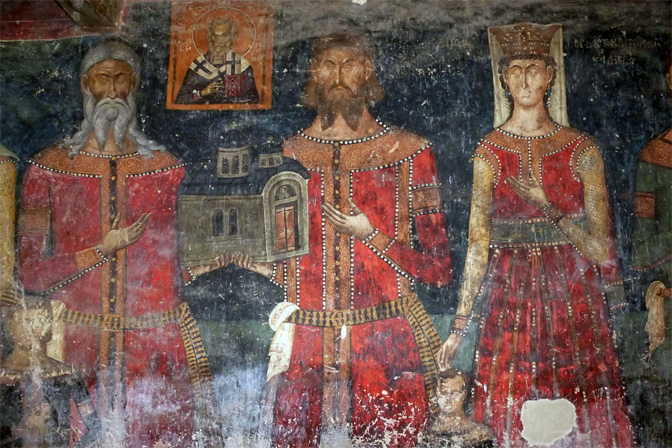 Ктиторска композиција у цркви Светог Николе у Псачи: кнез Паскач, његов син севастократор Влатко Паскачић, и његова супруга Владислава (Фото: Јасмина С. Ћирић)
