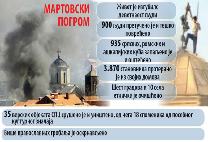 – Овде остајете и даље – рекли су ујутру. У граду је привремено утихло; племе је одмарало за нови јуриш (…) Ускоро су почеле пристизати нове вести. У пламену је Обилић, Призрен, Гњилане, Липљан, Храм Светог Саве и гробље у Косовској Митровици. На удару је свака српска душа. За Косово Поље никог не питамо; ту, пред нашим очима одреда горе српске куће, па пошта, школа, Дом здравља и Руска војна болница.