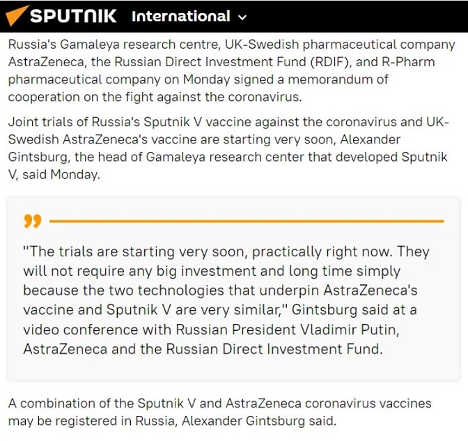 Из вијести Спутњика по потписивању меморандума о сарадњи Центра Гамалеја и Астра Зенеке децембра 2020: „Испитивања почињу веома брзо, практично одмах. Неће захтијевати велика улагања ни дуго времена просто зато што су технологије у основи Астра Зенеке и Спутњика V веома сличне“, изјавио је Гинцбург на видео конференцији с руским предсједником Владимиром Путином, Астра Зенеком и Руским фондом за директна улагања