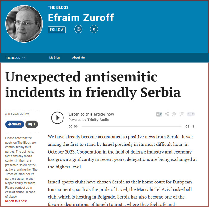 У ауторском тексту за Тајмс ов Израел, Зуроф је навео да је Србија у претходном периоду слала позитивне сигнале у односима са Израелом, али да су недавни догађаји изазвали забринутост, уз упозорење да, како тврди, могу да доведу до насиља.