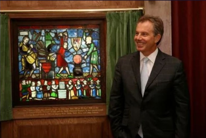 Тони Блер, предсједник владе Енглеске 1997-2007, поред витража Odds and quads направљеног 1910. у оквиру прославе Фабијанског друштва (Извор: Блог Франсес Лидер)