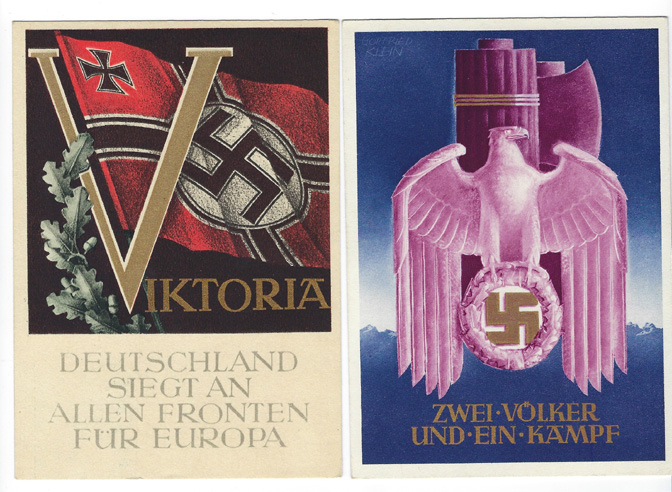 На првој разгледници на немачком пише: Немачка побеђује на свим фронтовима у Европи. На другој: Два народа, једна борба. На трећој разгледници стоји цитат Адолфа Хитлера