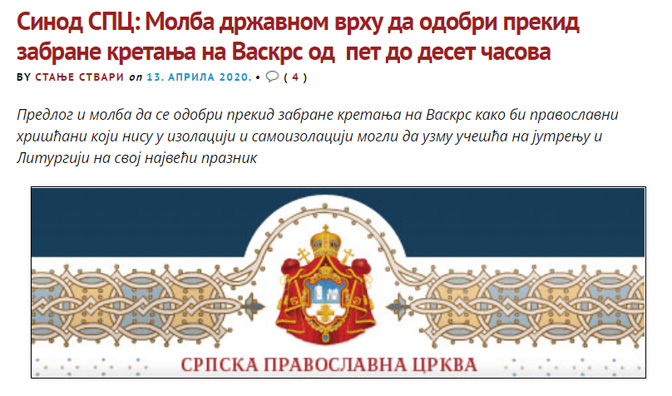 Молимо Вас да захтевате од државних власти да се временски оквир ограничења слободе кретања прилагоди праву православних верника да учествују на Светим Литургијама, стоји у молби патријарху Иринеју