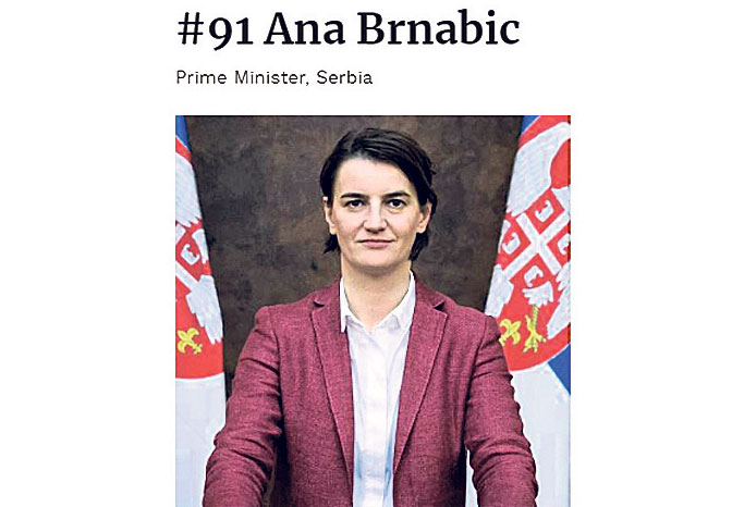 Ана Брнабић се ове године нашла међу 100 најмоћнијих жена света, објавио је амерички магазин „Форбс”. – Прва на листи Ангела Маркел, друга Тереза Меј