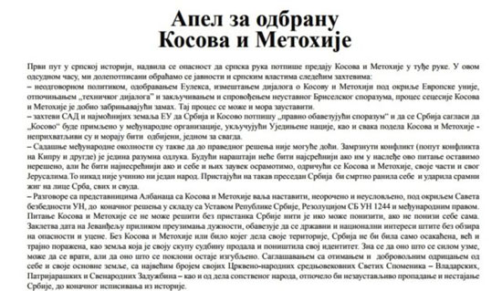 У Апелу се захтева да Србија не призна независност „Косова“, ма у којој форми, укључујући и „правно обавезујући споразум о свеобухватној нормализацији односа“. Тражи се, такође, да се не улази у погодбе о подели Косова и Метохије, нити о столици за „Косово“… Read More ›