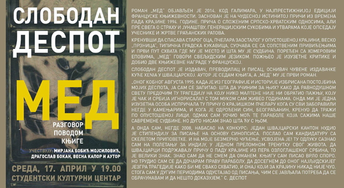 У среду, 17. априла у 19 сати, у Студентском културном центру разговор о „Меду“ Слободана Деспота