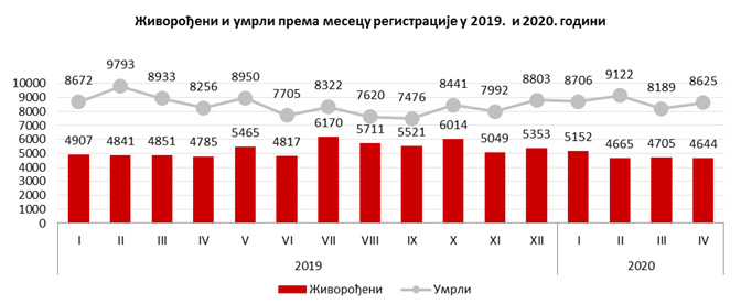 Број умрлих у Републици Србији у периоду јануар-април 2020. године износио је 34 642 и, у односу на исти период претходне године, када је број умрлих био 35 654, бележи се пад од 1 012 или за 2,8%