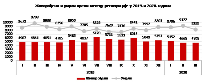 Број умрлих у Републици Србији у периоду јануар-март 2020. године износио је 26 017 и, у односу на исти период претходне године, када је број умрлих био 27 398, бележи се пад од 1 381 или за 5,0%