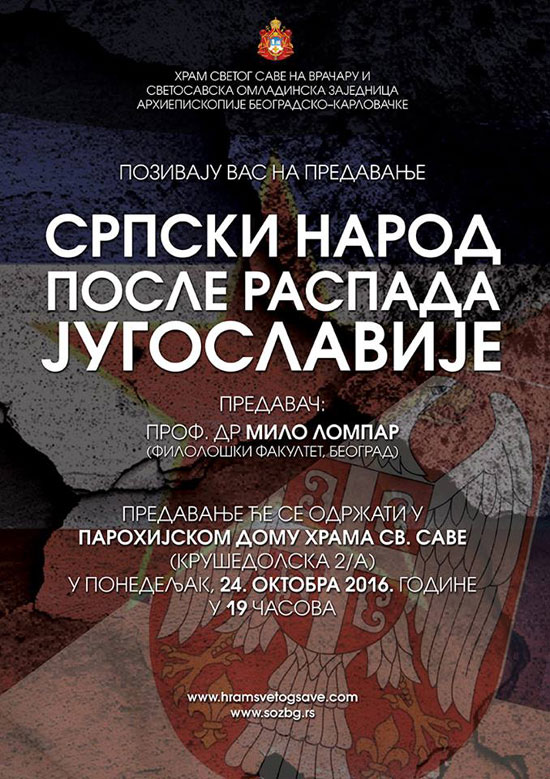 Позивамо вас, да у понедељак, 24. октобра 2016. године, у 19 часова, у великој сали парохијског дома Храма Св. Саве (Крушедолска 2/А) присуствујете предавању на тему „Српски народ после распада Југославије“.
