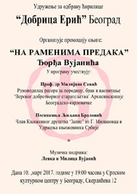 Српски културни центар у Скерлићевој 12 је 10. марта 2017. године био пун пре почетка представљања књиге „На раменима предака“ малог песника Ђорђа Вујанића из Срезојеваца код Горњег Милановца.
