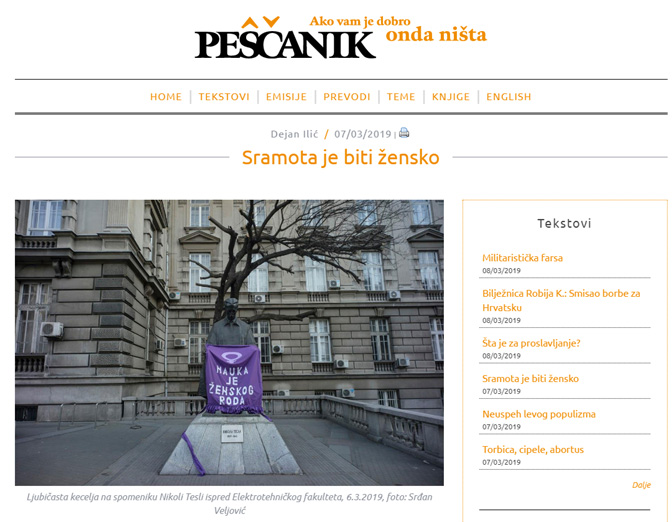Реаговање на текст Дејана Илића „Sramota je biti žensko“, Пешчаник, 7. 3. 2019.