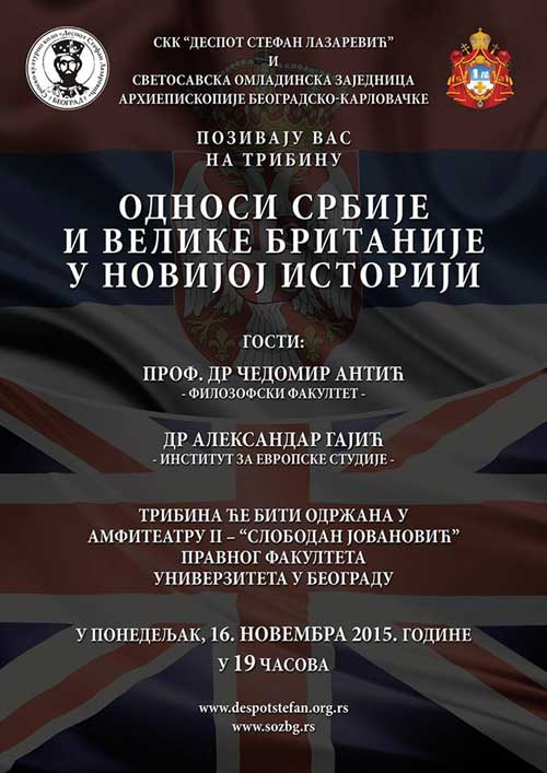 СКК „Деспот Стефан Лазаревић“ и Светосавска омладинска заједница Архиепископије београдско-карловачке позивају вас на трибину „ОДНОСИ СРБИЈЕ И ВЕЛИКЕ БРИТАНИЈЕ У НОВИЈОЈ ИСТОРИЈИ“