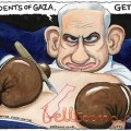 На карикатури се види Нетанијаху са боксерским рукавицама и са скалпелом изнад свог голог стомака док прави рез у облику Газе, са натписом: „Становници Газе, излазите одмах“