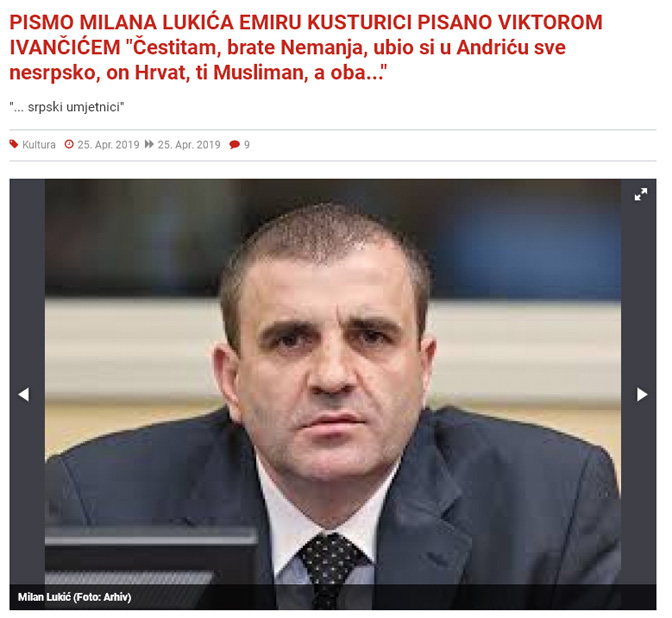 Pismo Milana Lukića Emiru Kusturici pisano Viktorom Ivančićem: „Čestitam, brate Nemanja, ubio si u Andriću sve nesrpsko…“