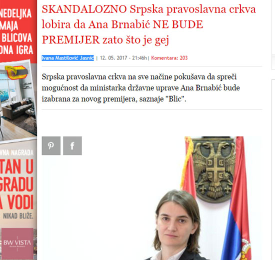 Блиц: Српска православна црква лобира да Ана Брнабић не буде премијер зато што је геј Српска православна црква на све начине покушава да спречи могућност да министарка државне управе Ана Брнабић буде изабрана за новог премијера, сазнаје „Блиц“.